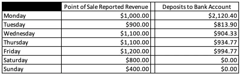 If the above moving parts consist of two or even three separate parties (Passport, a third party gateway and/or a third party processor) reconciling can be difficult, as you must piece together how your records of sales at the point of sale device relate to the money coming into your bank account. Take a look at the example below: